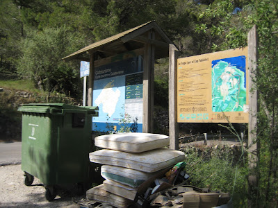 Estas imágenes, tomadas hace unos días, muestran el estado de uno de los puntos indicadores del recorrido que transcurre por La Trapa, en el municipio de Andratx. Podriamos decir que es un punto multiservicio, ya que aúna el punto de información cicloturistico y a la vez, el de recogida de basuras. Cuando menos, es desafortunada la coincidencia de ambos, y mas aun, si por dejadez, consentimos que este se convierta en un basurero descontrolado. Lamentable imagen.